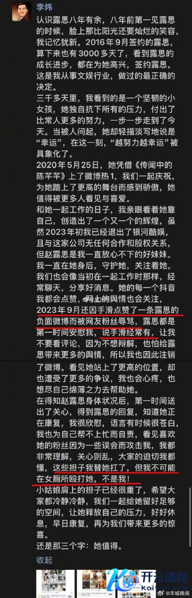近日,演员赵露想因"被送病院抢救"干系事件屡次登上热搜,握续激勉公众关注和热议。据赵露想好友爆料,赵露想曾因试戏失败而被公司东谈主员殴打体育游戏app平台,随后赵露想本东谈主也发文承认此事。 "殴打传说"被曝出后,不少网友开动怀疑赵露想经纪公司星河酷娱前雇主李炜。 1 月 1 日晚,李炜在个东谈主酬酢账号发长文回话近期争议。 李炜暗意 2016 年签下赵露想是我方从事娱乐行业以来,作念的最正确的决定之一。我方天然仍是于 2023 年头退出星河酷娱,但赵露想一直是我方宽心不下的好妹妹。"得知赵露