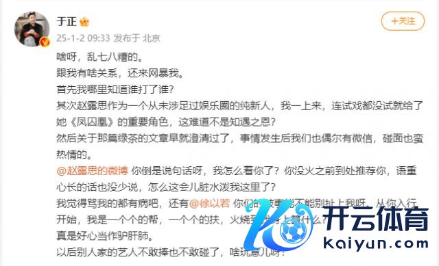 于正也发文回话与赵露想干系传说。他暗意,热议话题跟我方无关,不知谈谁打了谁,过去试戏齐没试就让纯新东谈主的赵露想出演了《凤求凰》,关联"绿茶"的著述也仍是通晓,过后两东谈主碰头也蛮形态,"火烧到我身上算什么?"