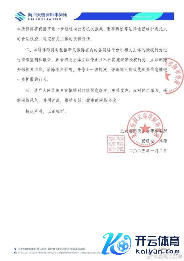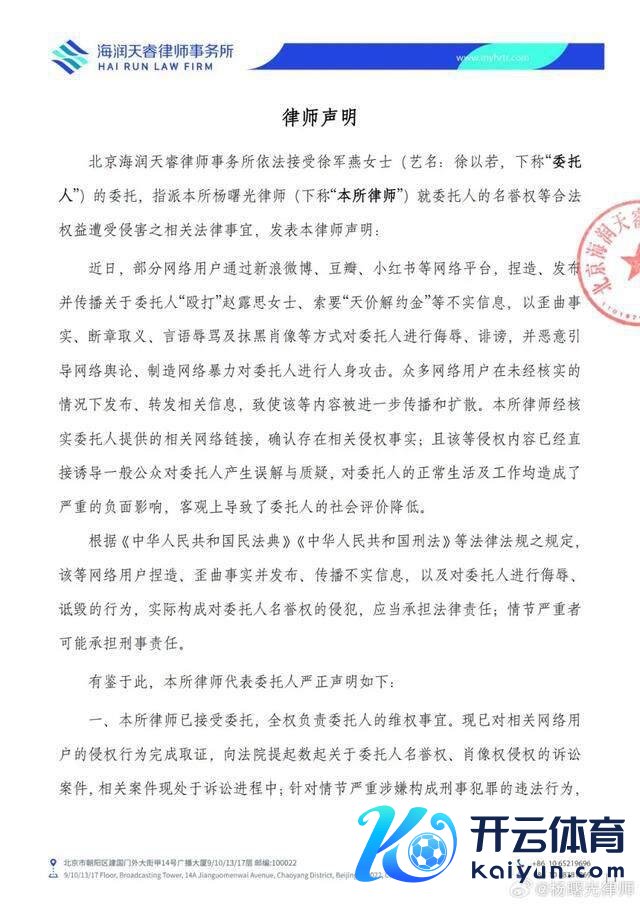 1 月 2 日,杨朝阳讼师发布讼师声明称:"本讼师照章经受徐军燕(艺名:徐以若)女士交付,就其名誉权等正当权利碰到侵害及维权使命开展干系法律事宜。"